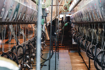 Image of cow milking facility,Industrial milking cows and mechanized milking equipment in farm.