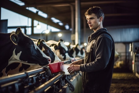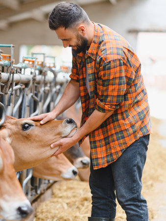 Young farmer gently caressing a cow's head in a modern barn, showcasing the bond between human and animal in sustainable farming practices