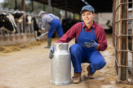 Portraif of caucasian woman dairy farm worker carrying metal milk can in cowshed