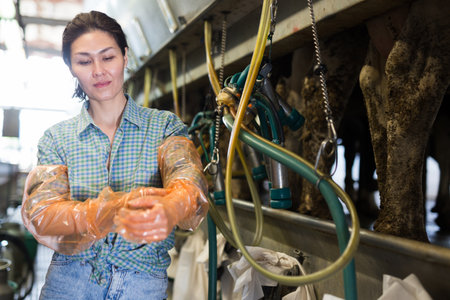 Asian dairy-woman preparing for machine milking cows