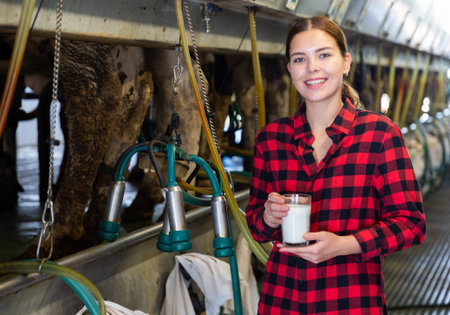Young female worker with glass of milk at milking parlor