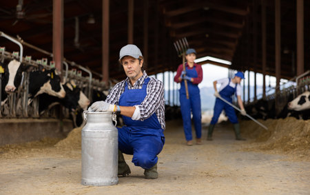 Farmer man holds milk can at cow farm