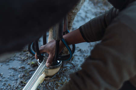 Connecting plugs to cow udder - the usual everyday work of farmers with milking machine