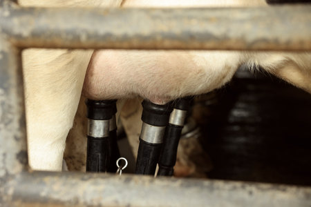 Technological cows milk pumping automat working on cattle udder close up. Modern milking system producing fresh dairy in mechanical cowshed. Agricultural livestock facility on computerized manufacture