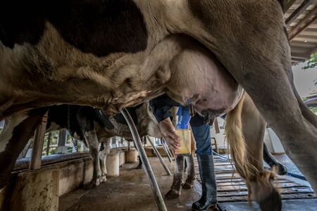 Worker milking milk form cow milk in dairy farm