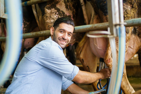 Happy cheerful Middle East - Asian male farmer collecting a dairy milk and smiling to camera. Male vet or veterinarian inspecting a livestock cows in farm.