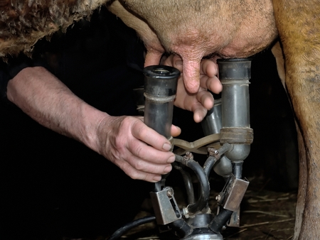 Cow milking mechanized milking equipment.