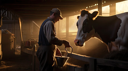 Farmer gently milking a cow, focusing on the hand-milking process and the bucket filling up with fresh milk in a rustic barn. --chaos