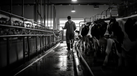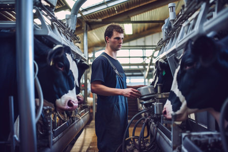 A worker is milking cows on a farm.