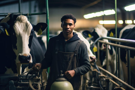 A young farmer woman cow milking with facility and modern mechanized milking equipment. Generative Ai