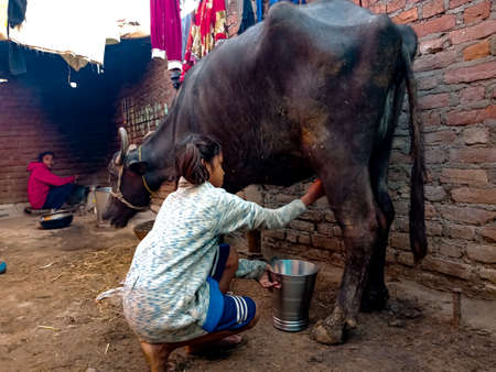 DISTRICT KATNI, INDIA - JANUARY 04, 2020: A dairy farmer little girl milking her buffalo in her local dairy farm, An Indian farming scene.
