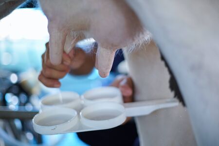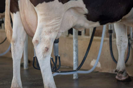cow teat being milked in dairy farm. milking of cattle in cowshed