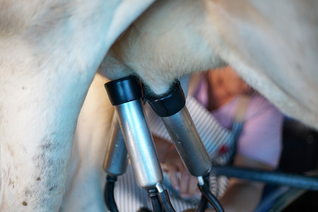 The milkmaid in farm by milking machine