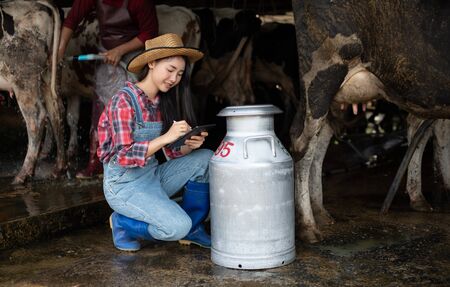 Asian women farming and agriculture industry and animal husbandry concept - young women or farmer with tablet pc computer and cows in cowshed on dairy farm with cow milking machines