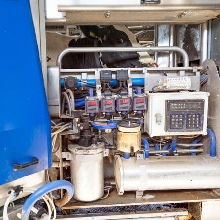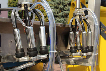 Milking machine close-up. Milk production on a home farm. Replacement of manual labor with automatic machines.