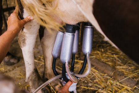 Farmers hands milking a dairy cattle in a local dairy farming. Milking a cow with milking machine in a barn. Agriculture, livestock, dairy cow concepts. Focus on hand.