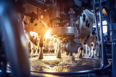 majestic cow calmly stands as a milking machine delicately extracts fresh milk from her udders.