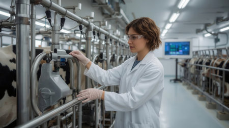 Female scientist wearing a lab coat and safety glasses working with automated milking equipment in a modern dairy farm. Cows are visible in the background.