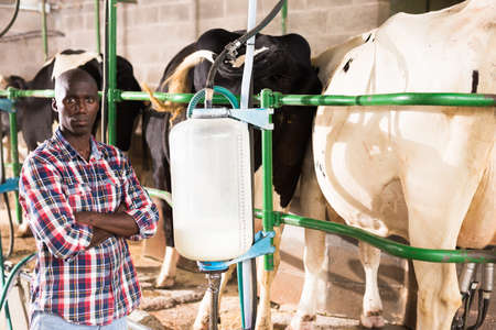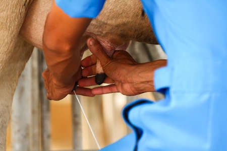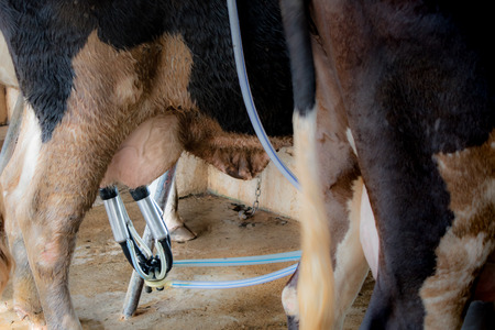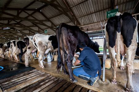 The process of Dairy cattle farming, Milking a cow the fresh milk, husbandry concept