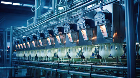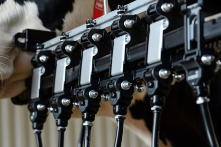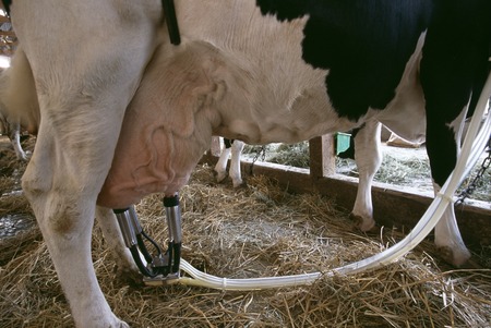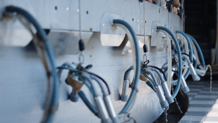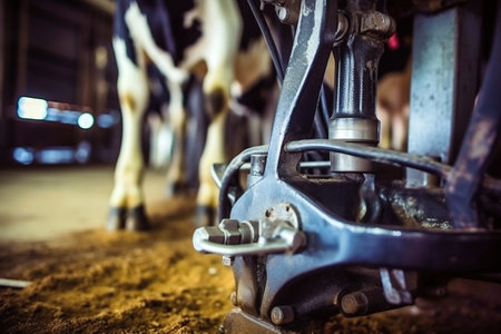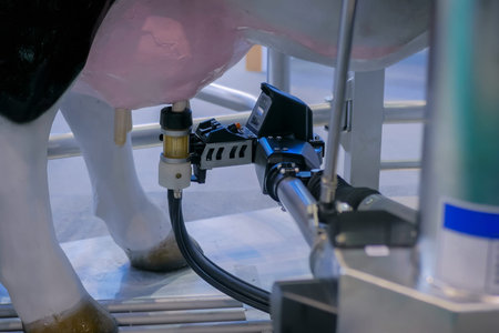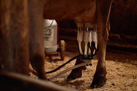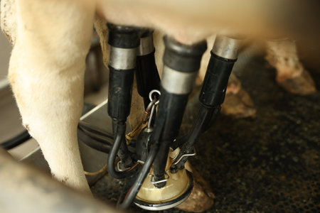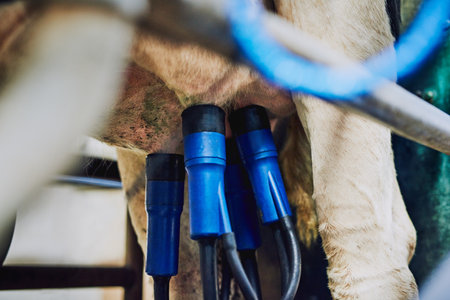 Modern milk pumping system working on cow udder producing fresh liquid close up. Technological milking automat using to production dairy food on industrial robotic farm. Cattle husbandry concept.