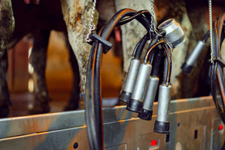 Cow milking facility and machine milking equipment in farm, selective focus.