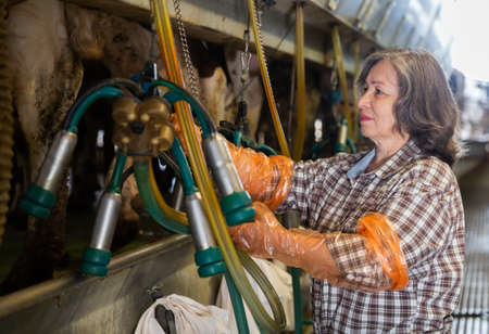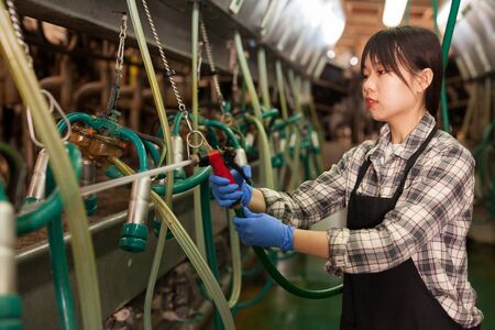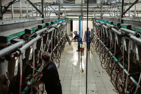 Minsk Belarus - February 9, 2021: milkmaids on the farm. Cow farm for milk production