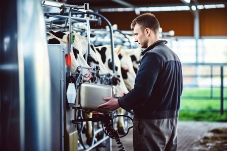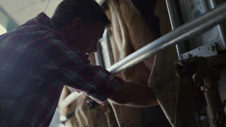 Farm worker checking milking automat on mechanical livestock facility. Focused man ranch employee inspecting work milk production system in automatic barn. Modern technology in agro manufacture.