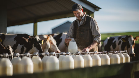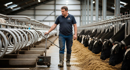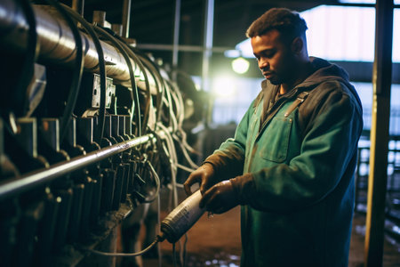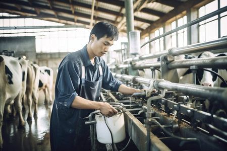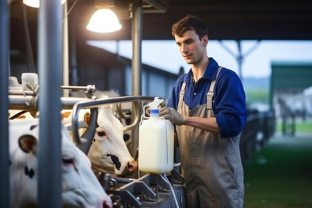 A farmer is seen tending to his cows in a modern dairy farm, ensuring their well-being and productivity.