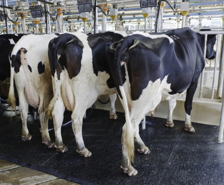 In a modern dairy facility, a line of cows stands ready for milking. This close-up view highlights the full udders, the source of fresh milk, showcasing the scale and process of commercial dairy farming and food production.