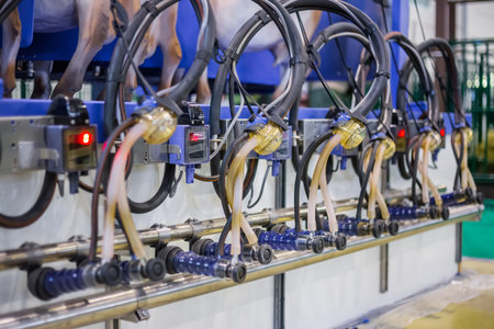 Automated goat milking suction machine with teat cups at cattle dairy farm, exhibition, trade show. Farming, automated technology equipment, agriculture industry, animal husbandry concept