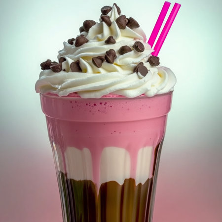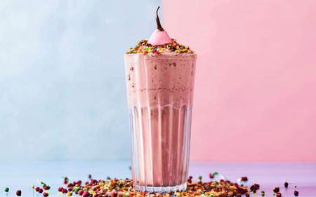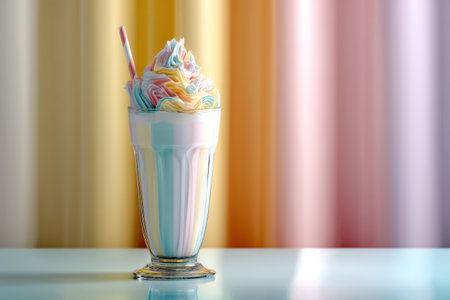 A tall glass of milkshake features colorful whipped topping with a whimsical design, placed on a table against soft pastel backgrounds.