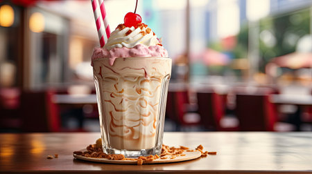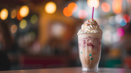 Delicious creamy milkshake topped with whipped cream, sprinkles, and a cherry at a dessert shop
