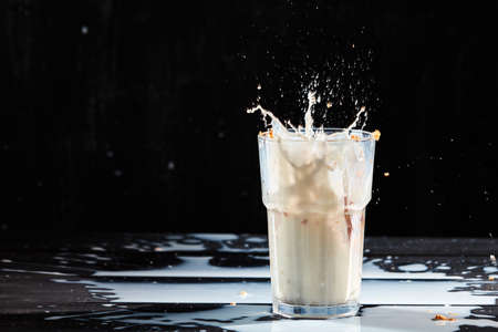 Milk or white liquid splash and oat flakes, muesli in the glass on a black background