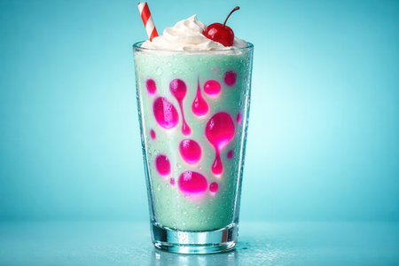 Vibrant Turquoise Milkshake With Pink Liquid Drops And Whipped Cream Topped With Cherry In Glass