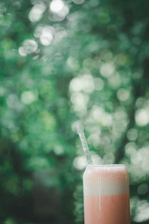 Frappe sweet of pink milk in glass, delicious drink for summer on nature background