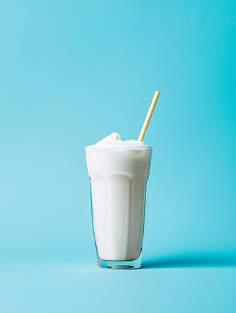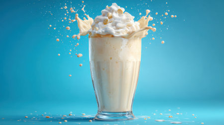 A tall glass filled with a creamy milkshake overflows as it splashes, creating a playful scene. The blue background enhances the lively and refreshing atmosphere of the drink.