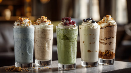 A bright assortment of delicious milkshakes and drinks is artistically arranged in tall glasses, featuring vibrant colors and toppings.