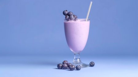 Glass of blueberry milk cocktail on blue background.