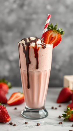 Decadent Strawberry Milkshake Delight with Cherry Topping on Marble Table