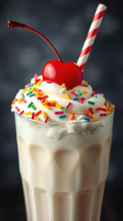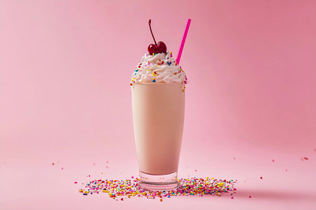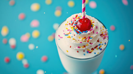 A delightful milkshake featuring creamy whipped cream, colorful sprinkles, and a bright cherry on top, perfect for any celebration or summer treat.