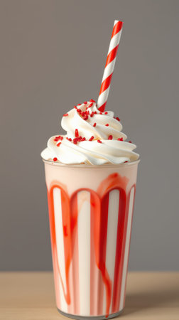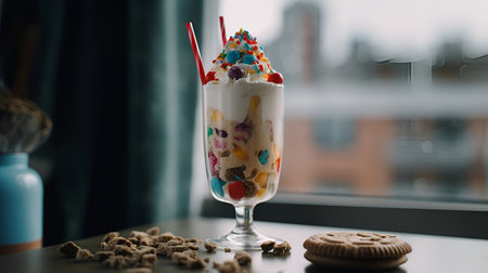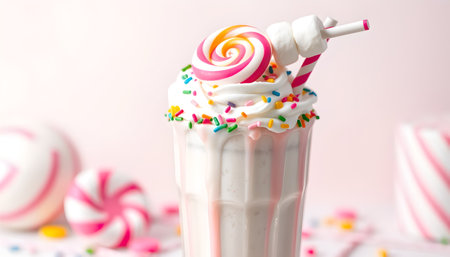 a striped straw poking out of a milkshake full of colorful sprinkles, created with generative ai