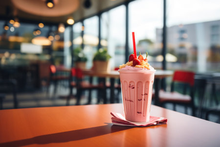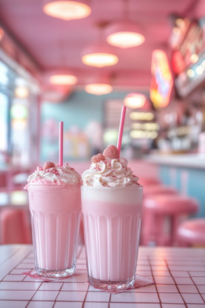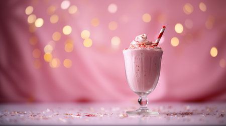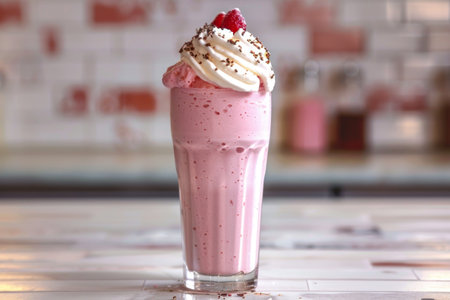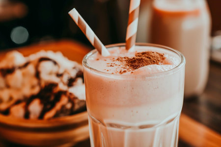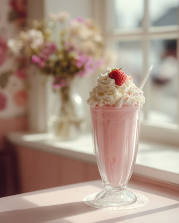 A sumptuous visual treat ideal for culinary blogs, dessert menus, or marketing content for cafes and diners | This image highlights the decadent simplicity of a classic milkshake, elevated by a generous dollop of whipped cream and a dusting of chocolate powder. Soft, natural light envelops the scene, lending warmth and enhancing the rich tones of the drink and its creamy topping. The glass, with its smooth contours and filled to the brim with the pink-hued shake, invites the viewer to taste its sweetness. Two striped straws suggest the drink is meant to be shared, evoking a sense of nostalgia and the joy of indulgence with a friend. The blurred background features an out-of-focus dessert, further reinforcing the atmosphere of a cozy dining experience and the variety of sweet options available. The composition of the image directs the attention firmly on the milkshake, making it the hero of this culinary narrative | Perfect for sparking desire in advertisements for dessert products or promotions for a restaurant's dessert menu, as well as evoking the pleasures of dining out in lifestyle magazines. This image can also be an appealing visual for social media campaigns featuring treat yourself themes or for use in decorating the walls of eateries to create inviting and appetizing interiors | a creamy textured milkshake topped with whipped cream, gracefully lit and focused to captivate the audience, with ample negative space for inclusion of copy or branding elements
