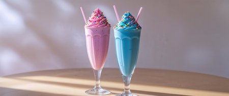 AI Generated. Two milkshakes with sprinkles served in tall glasses on a wooden table