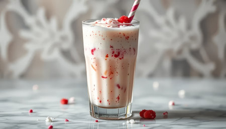 Glass of white milk with red raspberries and a straw in it. The drink is served on a marble countertop