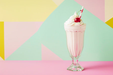 Retro-style tasty strawberry milkshake topped with whipped cream and cherry against pastel geometric background. Concept of 1950s diner nostalgia and playful sweet treats. Copy space