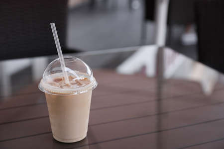 Plastic takeaway cup of delicious iced coffee on table in outdoor cafe, space for text