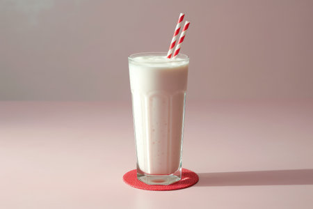 Milk shake in a glass with a striped straw on a pink background