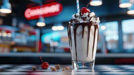 A delicious milkshake is served in a glass, adorned with whipped cream and cherries. The vibrant diner atmosphere features a modern design and bright signs.