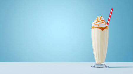A tall glass contains a vanilla milkshake topped with whipped cream and caramel drizzle. A red and white striped straw is inserted into the milkshake.