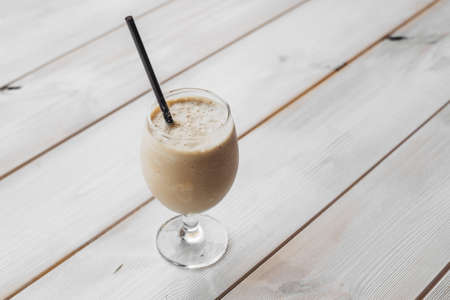 Glass of milkshake on bar counter in night club, stock photo